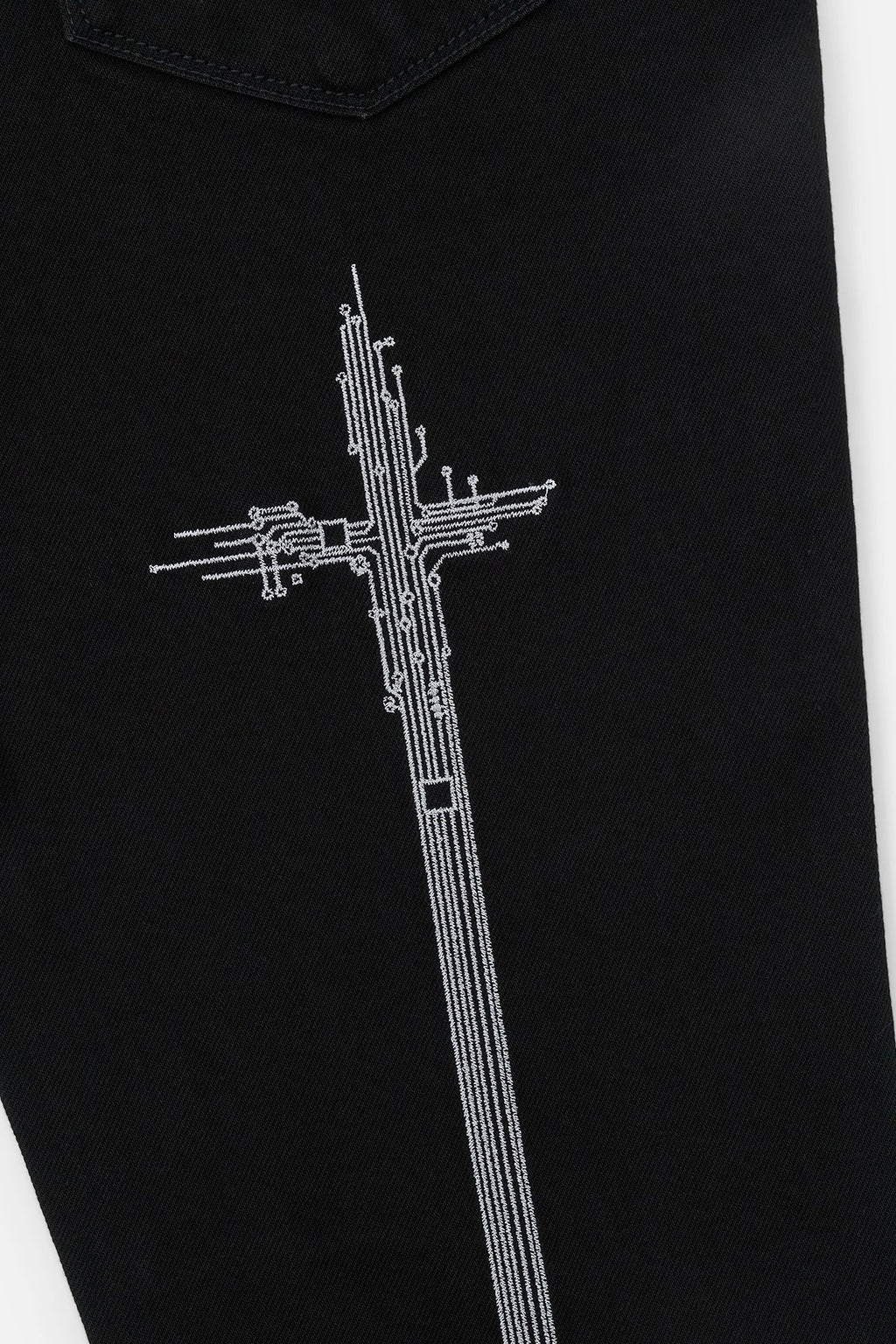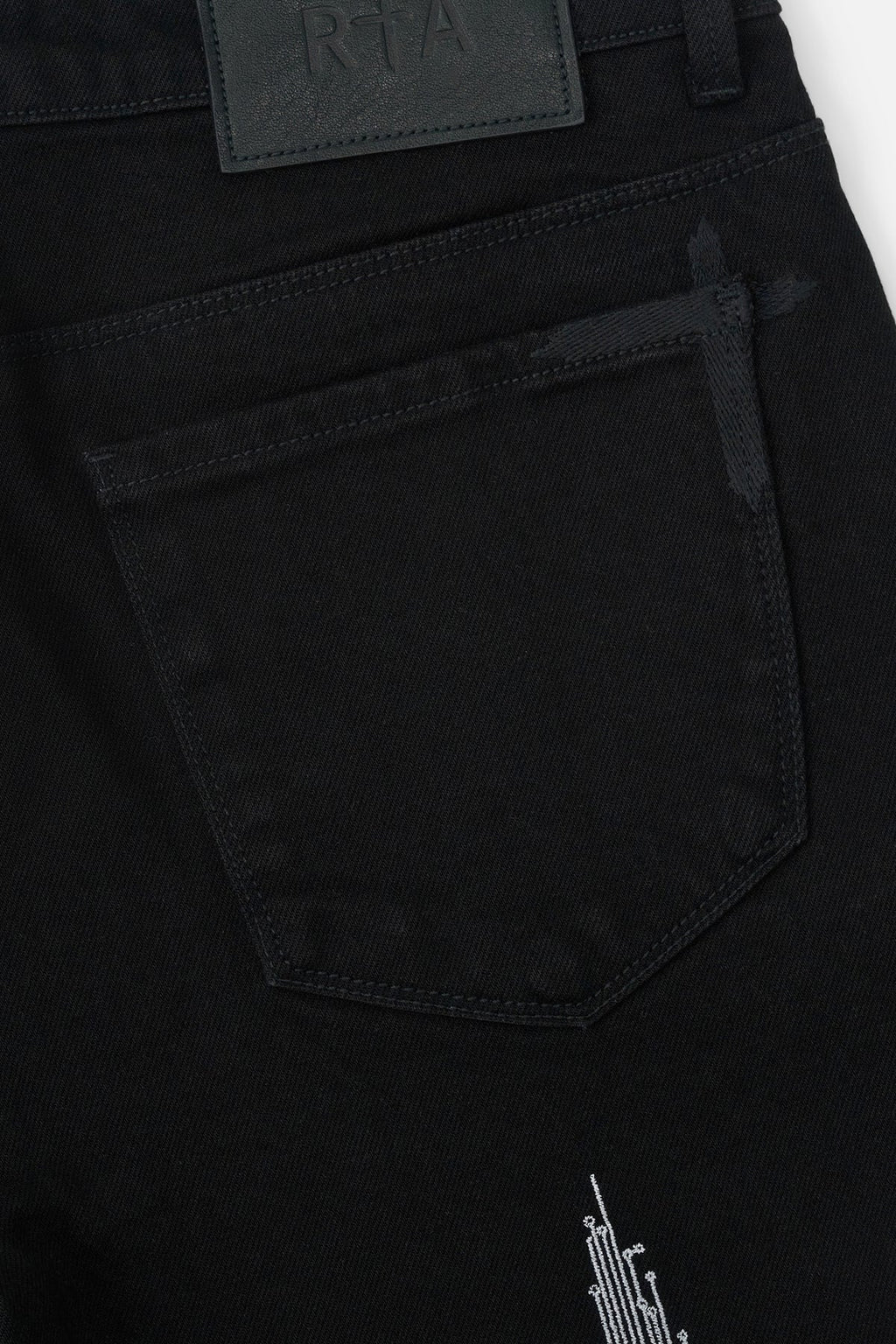 The Bryant Skinny Jean in Black Hologram Digital Cross is made from premium denim. Designed with a skinny fit and reinforced stitching on the inner thighs, these jeans feature the words "SYSTEM ERROR" in a digital style font above the knees, digitized RtA crosses down the back legs, the iconic RtA cross on the back pocket, and signature leather patch on the back waistband.