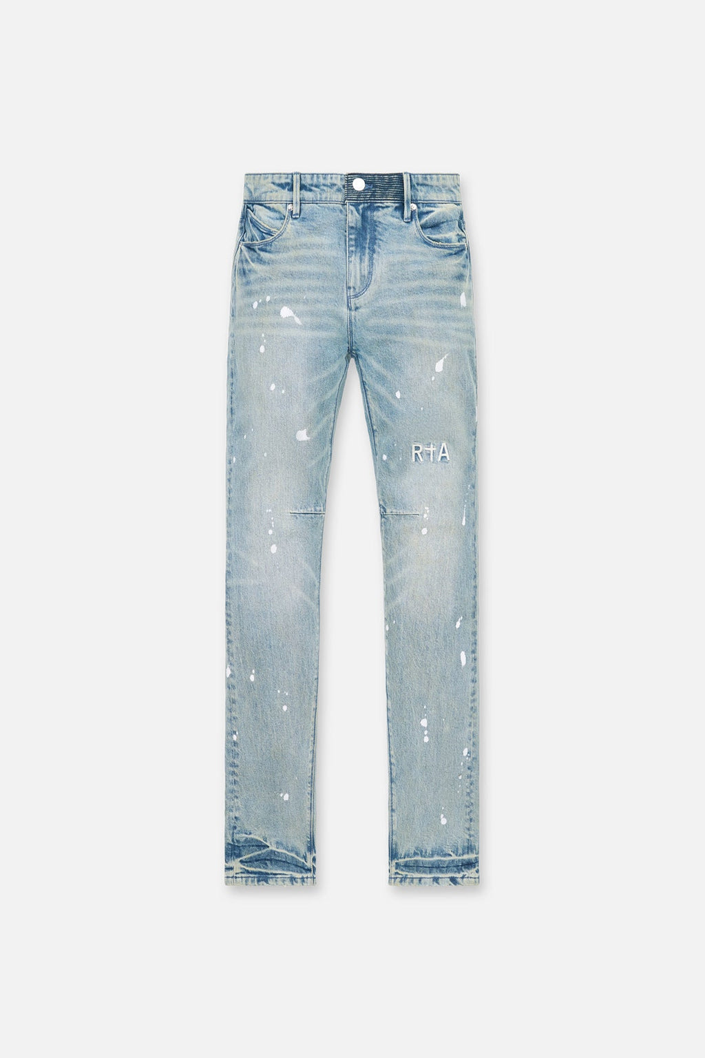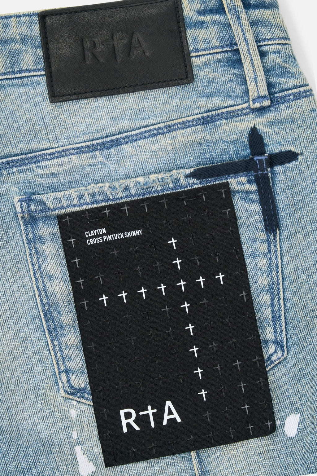 The Clayton Skinny Jean in Graphite Fade/Splattered Indigo Dusk is made from high-quality denim. Designed with a skinny fit and reinforced stitching on the inner thighs, these jeans feature a faded wash/an all over paint splatter, the iconic RTA cross on the back pocket/leg, the iconic RTA cross on the back pocket, signature leather patch on the back waistband, distressed detailing on the back pocket, and pin-tuck dagger seams down the back legs.