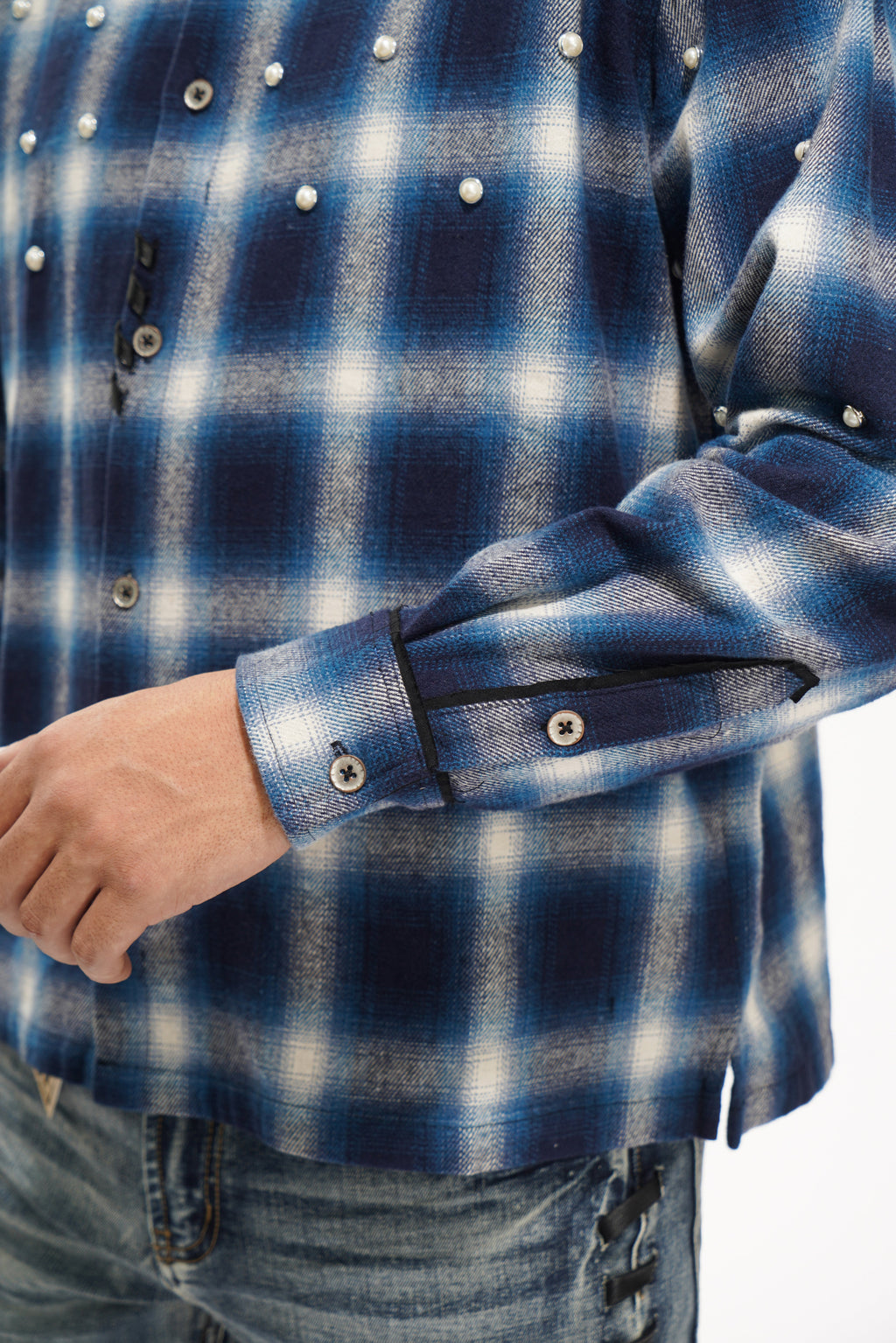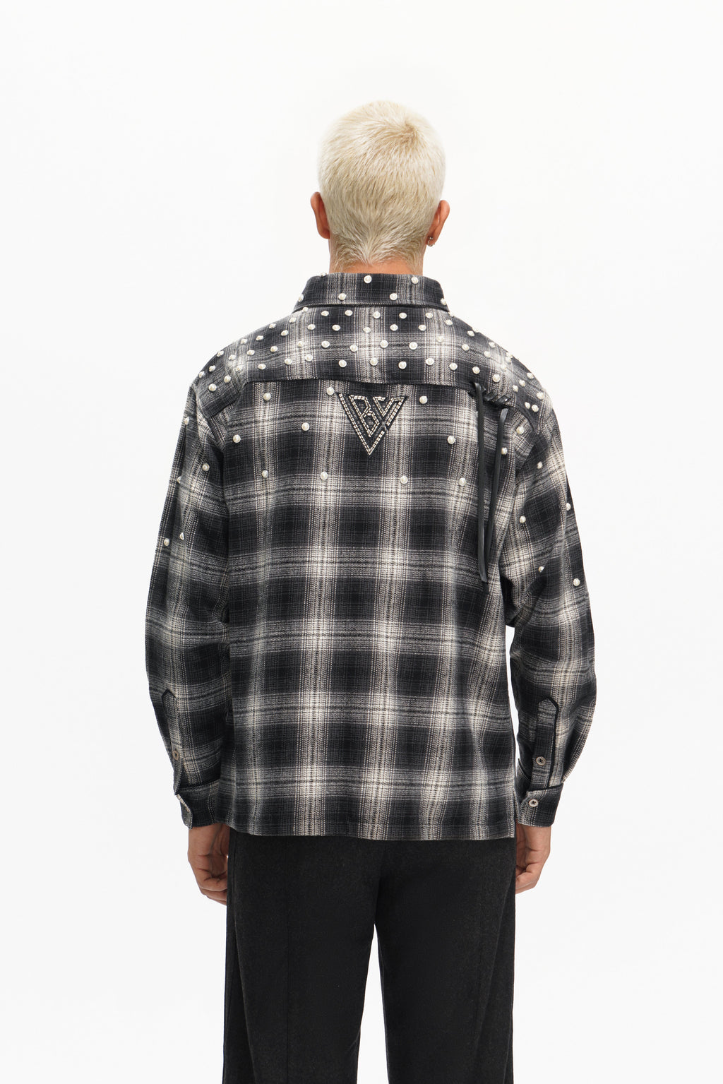 The VALABASAS Cadence Black Flannel redefines the timeless check shirt with bold detail and modern craftsmanship. Featuring a soft brushed flannel fabric in gradient blac tones, it’s adorned with pearl embellishments across the shoulders and upper chest — giving a classic silhouette a statement twist. A structured collar and button-up front balance rugged texture with refined finish, ideal for layering or standing alone as a centerpiece.